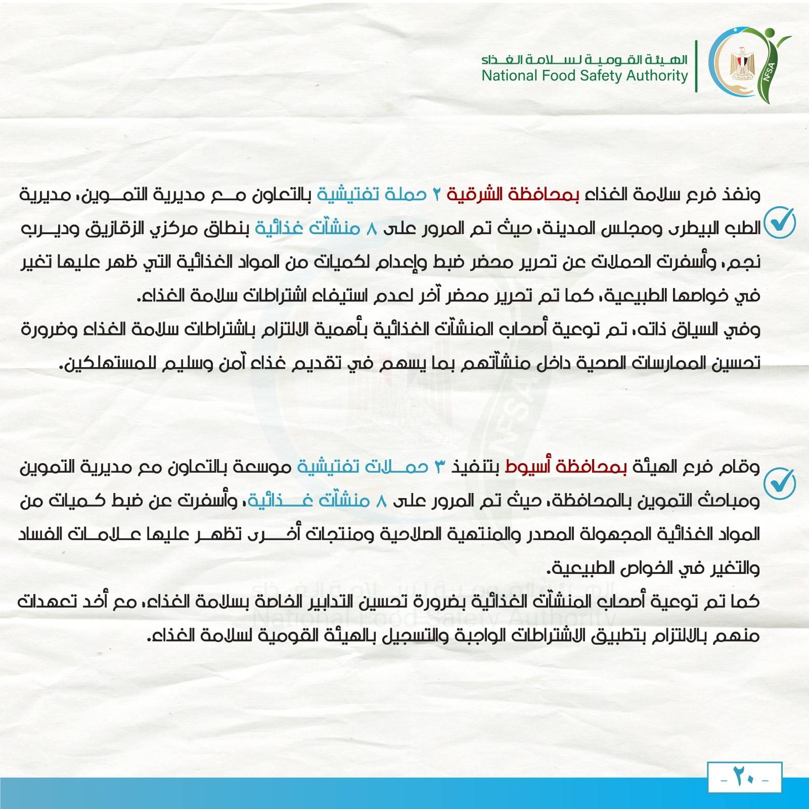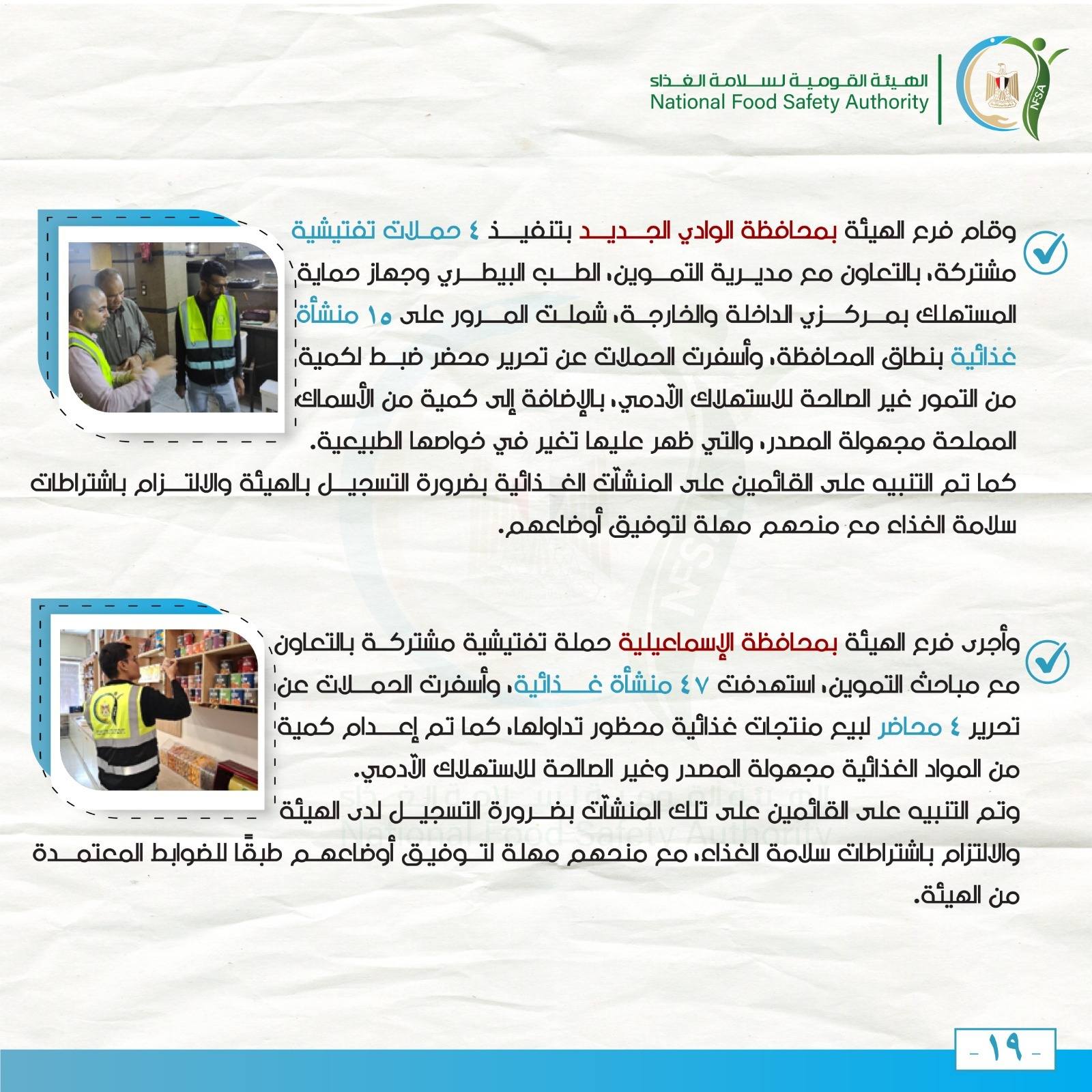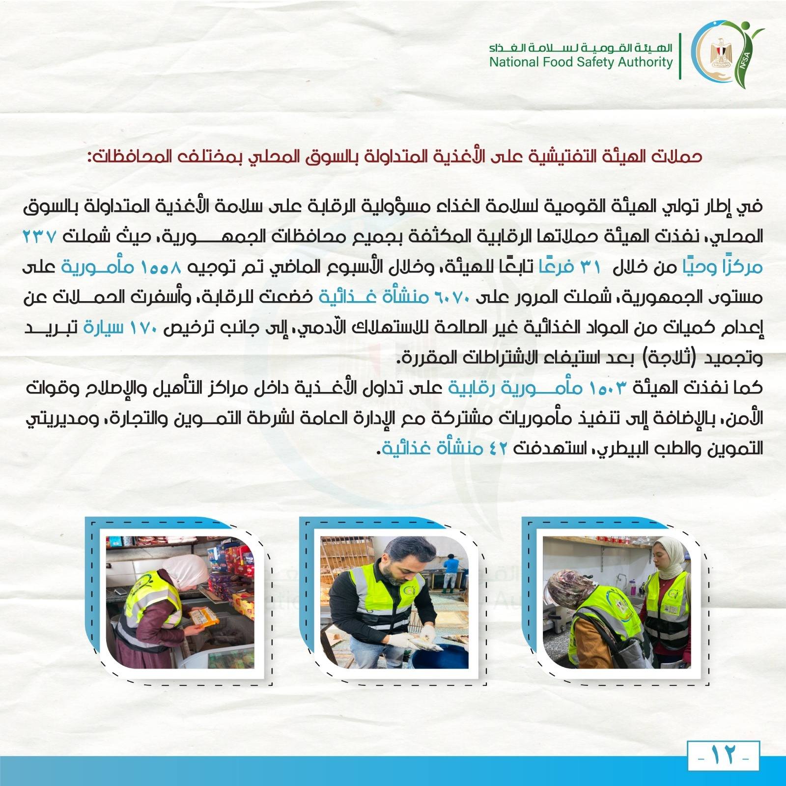 وفي إطار توجيهات الدكتور طارق الهوبي رئيس الهيئة القومية لسلامة الغذاء، نفّذت فروع الهيئة بالمحافظات حملات تفتيشية مشتركة بالتعاون مع الجهات الرقابية المعنية، استهدفت المنشآت الغذائية المختلفة، وذلك لتعزيز منظومة الرقابة على سلامة الغذاء، وضمان وصول منتجات آمنة وسليمة للمواطنين.