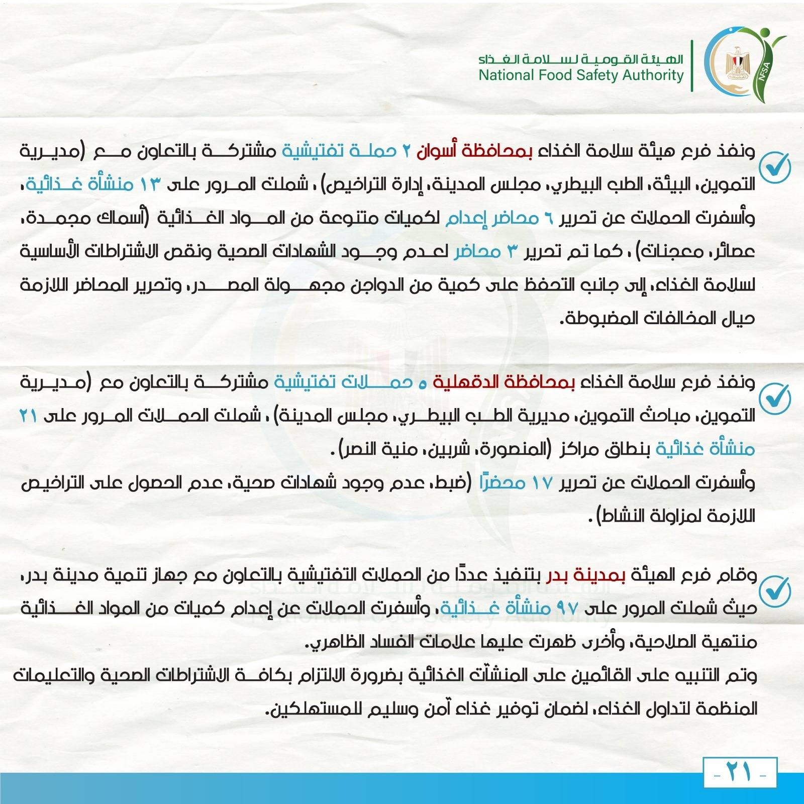 ونفذ فرع سلامة الغذاء بمحافظة الدقهلية 5 حملات تفتيشية مشتركة بالتعاون مع (مديرية التموين، مباحث التموين، مديرية الطب البيطري، مجلس المدينة)، شملت الحملات المرور على 21 منشأة غذائية بنطاق مراكز (المنصورة، شربين، منية النصر).
