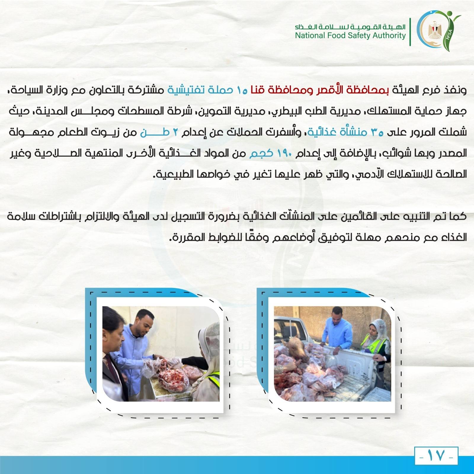 ونفذ فرع الهيئة بمحافظة الأقصر ومحافظة قنا 15 حملة تفتيشية مشتركة بالتعاون مع وزارة السياحة، جهاز حماية المستهلك، مديرية الطب البيطري، مديرية التموين، شرطة المسطحات ومجلس المدينة، حيث شملت المرور على 35 منشأة غذائية، وأسفرت الحملات عن إعدام 2 طن من زيوت الطعام مجهولة المصدر وبها شوائب، بالإضافة إلى إعدام 190 كجم من المواد الغذائية الأخرى المنتهية الصلاحية وغير الصالحة للاستهلاك الآدمي، والتي ظهر عليها تغير في خواصها الطبيعية.