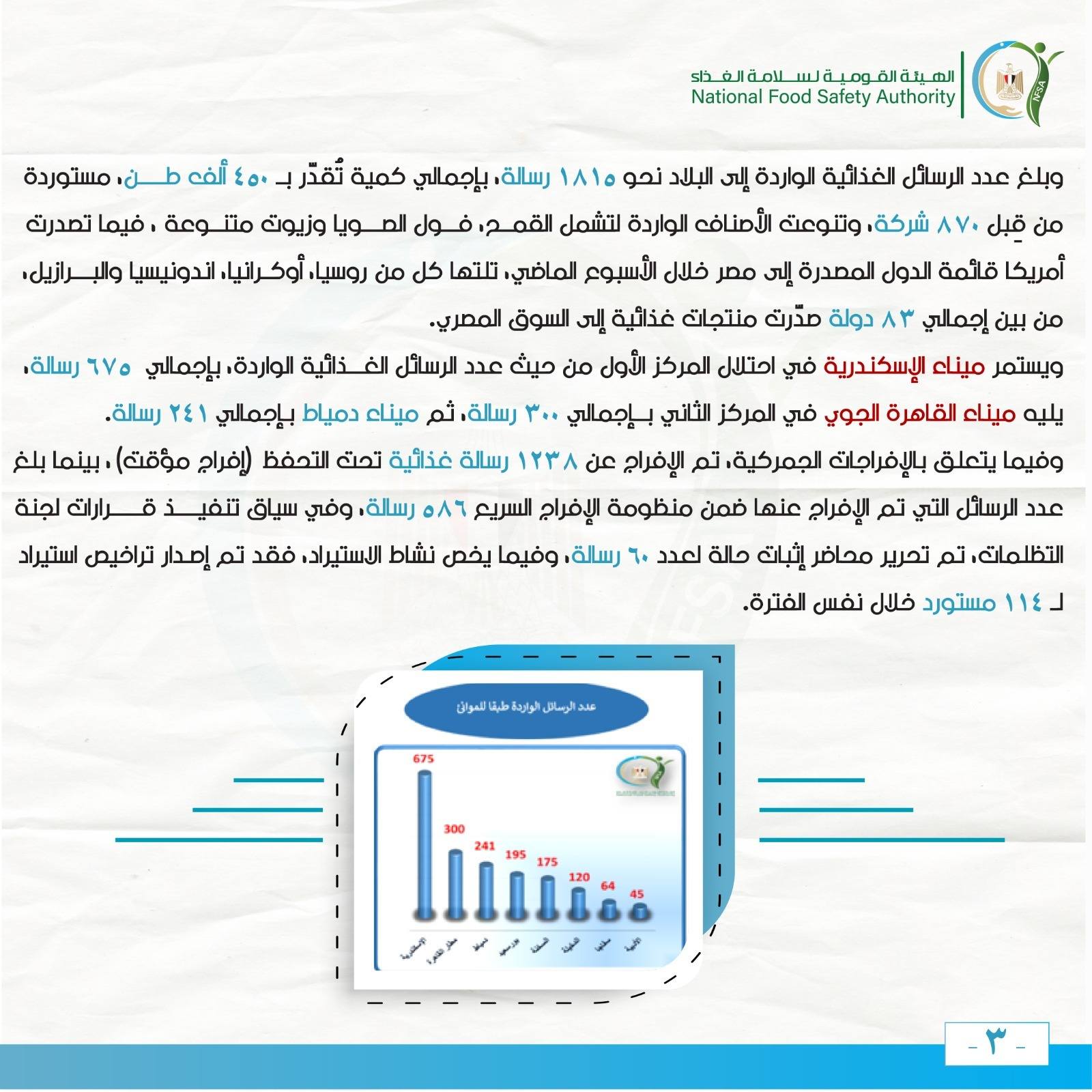 ويستمر ميناء الإسكندرية في احتلال المركز الأول من حيث عدد الرسائل الغذائية الواردة، بإجمالي 675 رسالة، يليه ميناء القاهرة الجوي في المركز الثاني بـــإجمالي 300 رسالة، ثم ميناء دمياط بـإجمالي 241 رسالة.