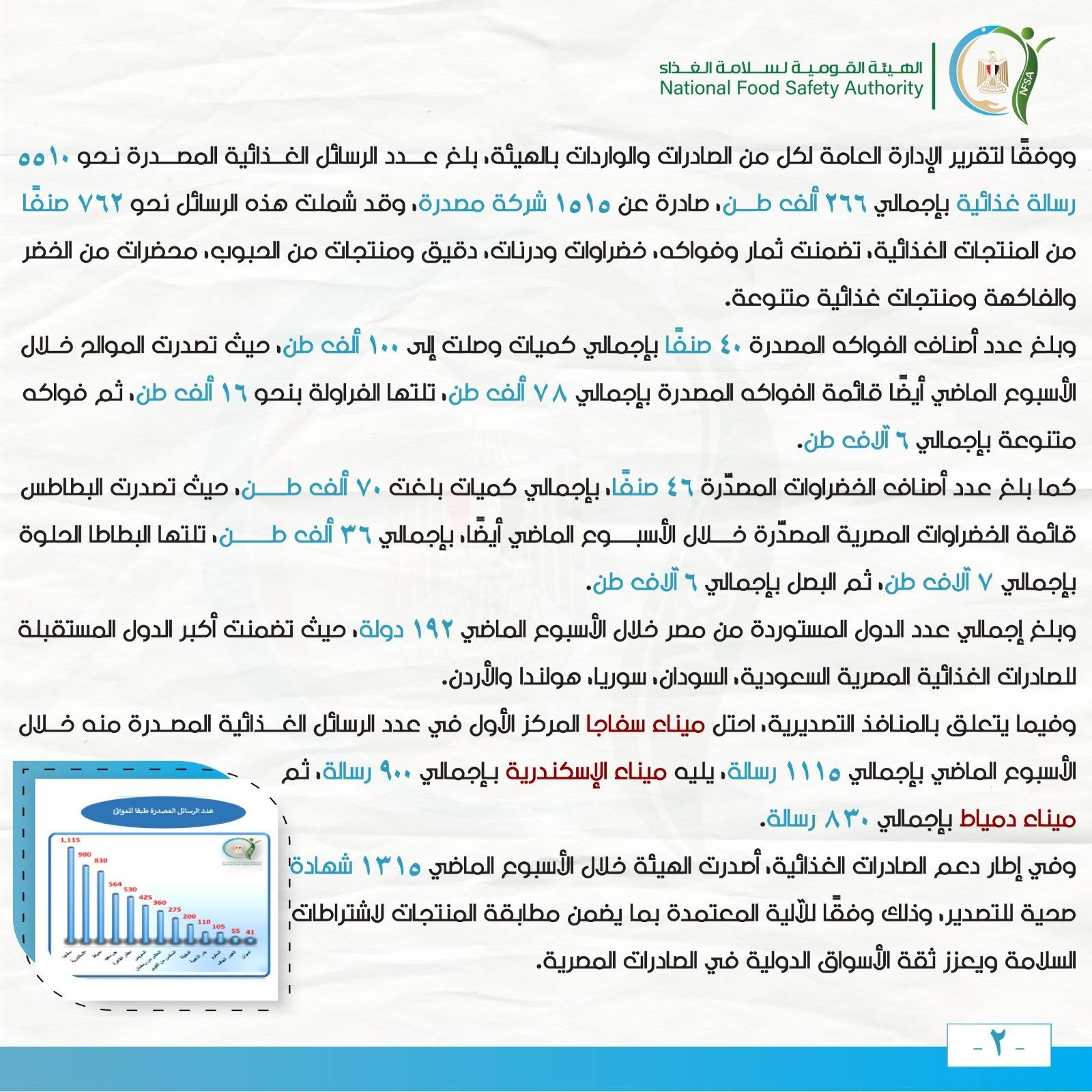 ووفقًا لتقرير الإدارة العامة لكل من الصادرات والواردات بالهيئة، بلغ عدد الرسائل الغذائية المصدرة نحو 5510 رسالة غذائية بإجمالي 266 ألف طن، صادرة عن 1515 شركة مصدرة، وقد شملت هذه الرسائل نحو 762 صنفًا من المنتجات الغذائية، تضمنت ثمار وفواكه، خضراوات ودرنات، دقيق ومنتجات من الحبوب، محضرات من الخضر والفاكهة ومنتجات غذائية متنوعة.