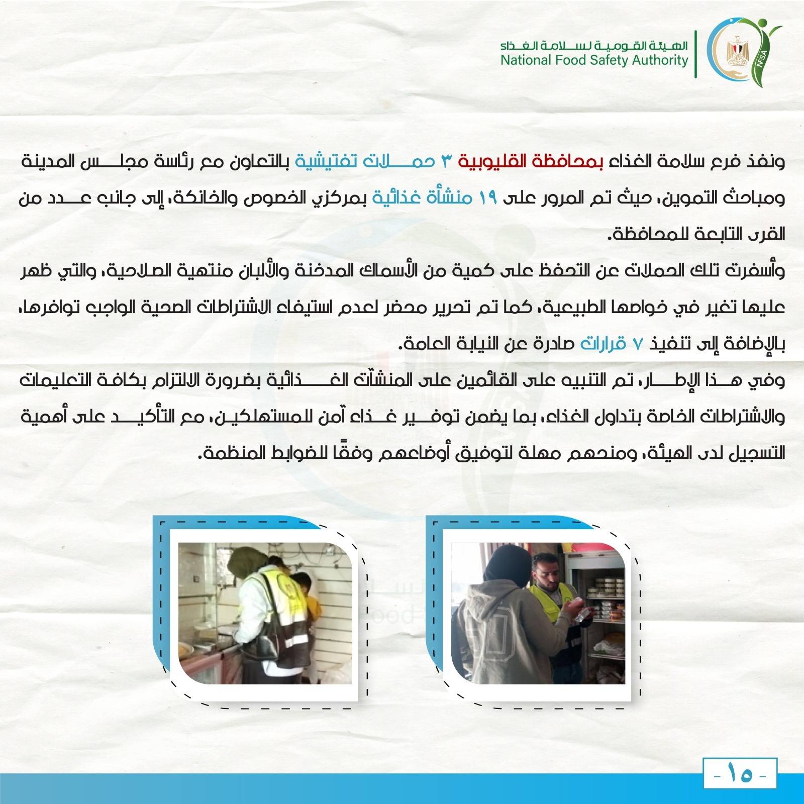 ونفذ فرع سلامة الغذاء بمحافظة القليوبية 3 حملات تفتيشية بالتعاون مع رئاسة مجلس المدينة ومباحث التموين، حيث تم المرور على 19 منشأة غذائية بمركزي الخصوص والخانكة، إلى جانب عدد من القرى التابعة للمحافظة.