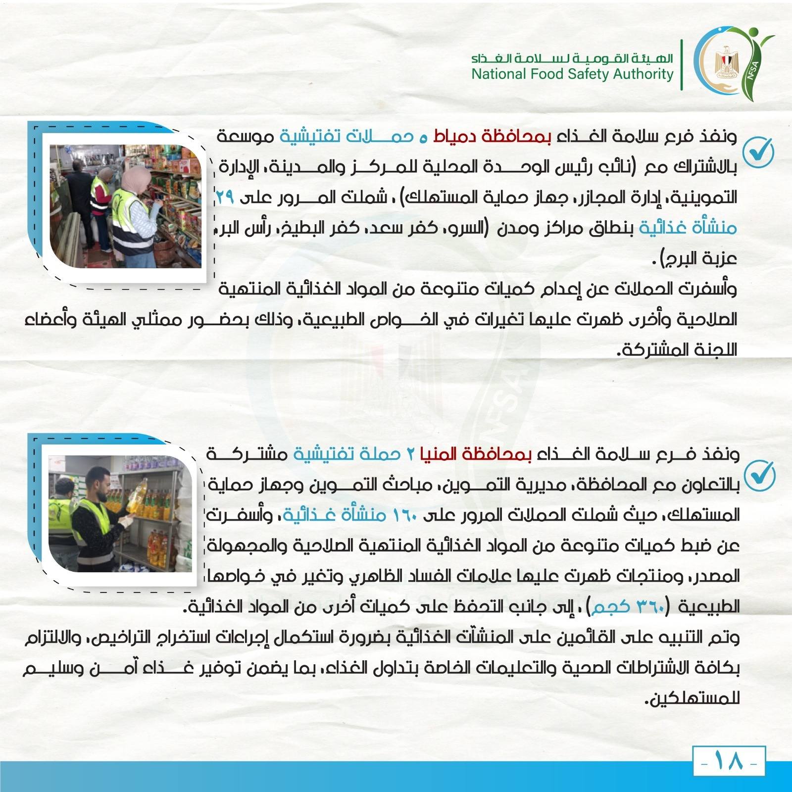 ونفذ فرع سلامة الغذاء بمحافظة دمياط 5 حملات تفتيشية موسعة بالاشتراك مع (نائب رئيس الوحدة المحلية للمركز والمدينة، الإدارة التموينية، إدارة المجازر، جهاز حماية المستهلك)، شملت المرور على 29 منشأة غذائية بنطاق مراكز ومدن (السرو، كفر سعد، كفر البطيخ، رأس البر، عزبة البرج).