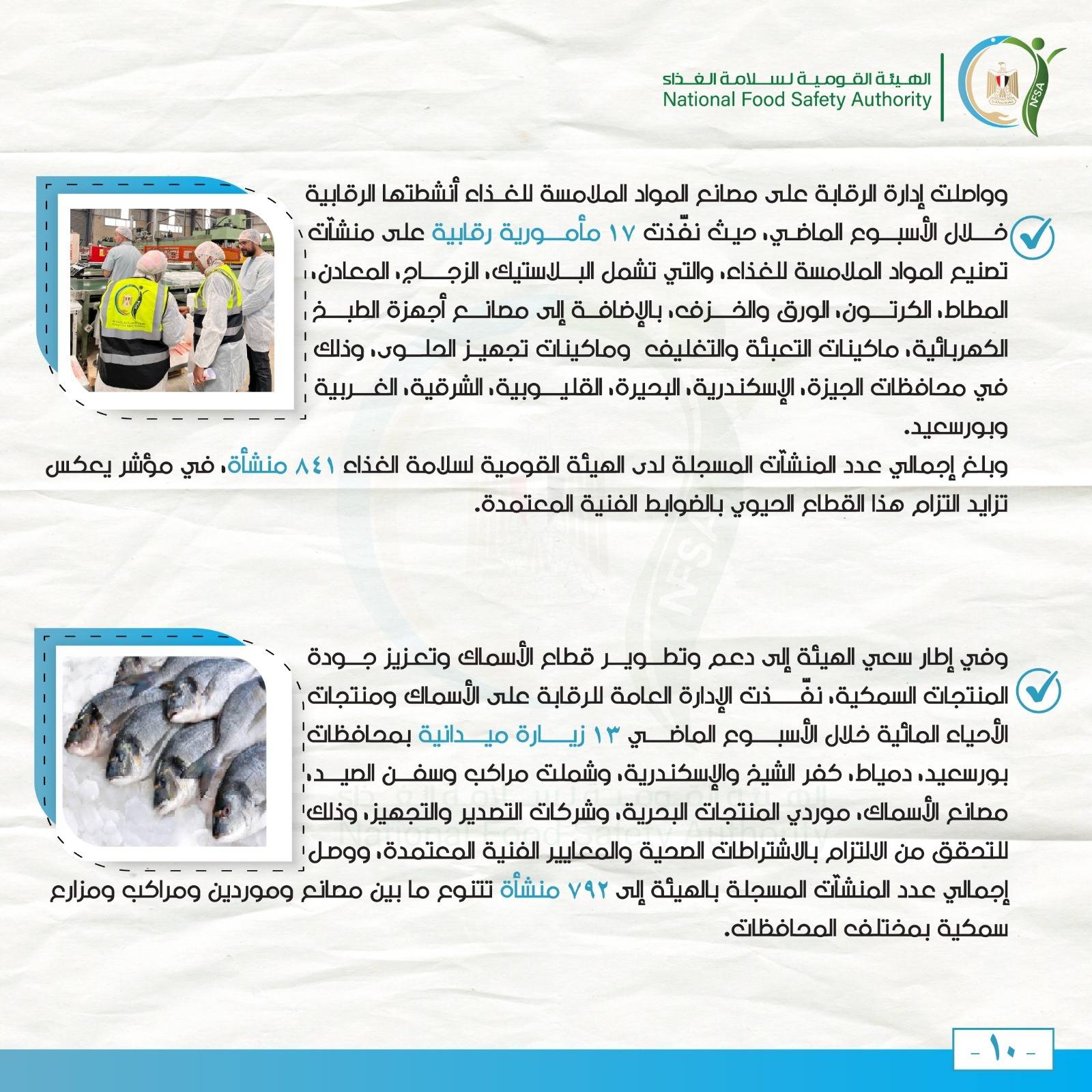 وفي إطار سعي الهيئة إلى دعم وتطوير قطاع الأسماك وتعزيز جودة المنتجات السمكية، نفّذت الإدارة العامة للرقابة على الأسماك ومنتجات الأحياء المائية خلال الأسبوع الماضي 13 زيارة ميدانية بمحافظات بورسعيد، دمياط، كفر الشيخ والإسكندرية، وشملت مراكب وسفن الصيد، مصانع الأسماك، موردي المنتجات البحرية، وشركات التصدير والتجهيز، وذلك للتحقق من الالتزام بالاشتراطات الصحية والمعايير الفنية المعتمدة، ووصل إجمالي عدد المنشآت المسجلة بالهيئة إلى 792 منشأة تتنوع ما بين مصانع وموردين ومراكب ومزارع سمكية بمختلف المحافظات.