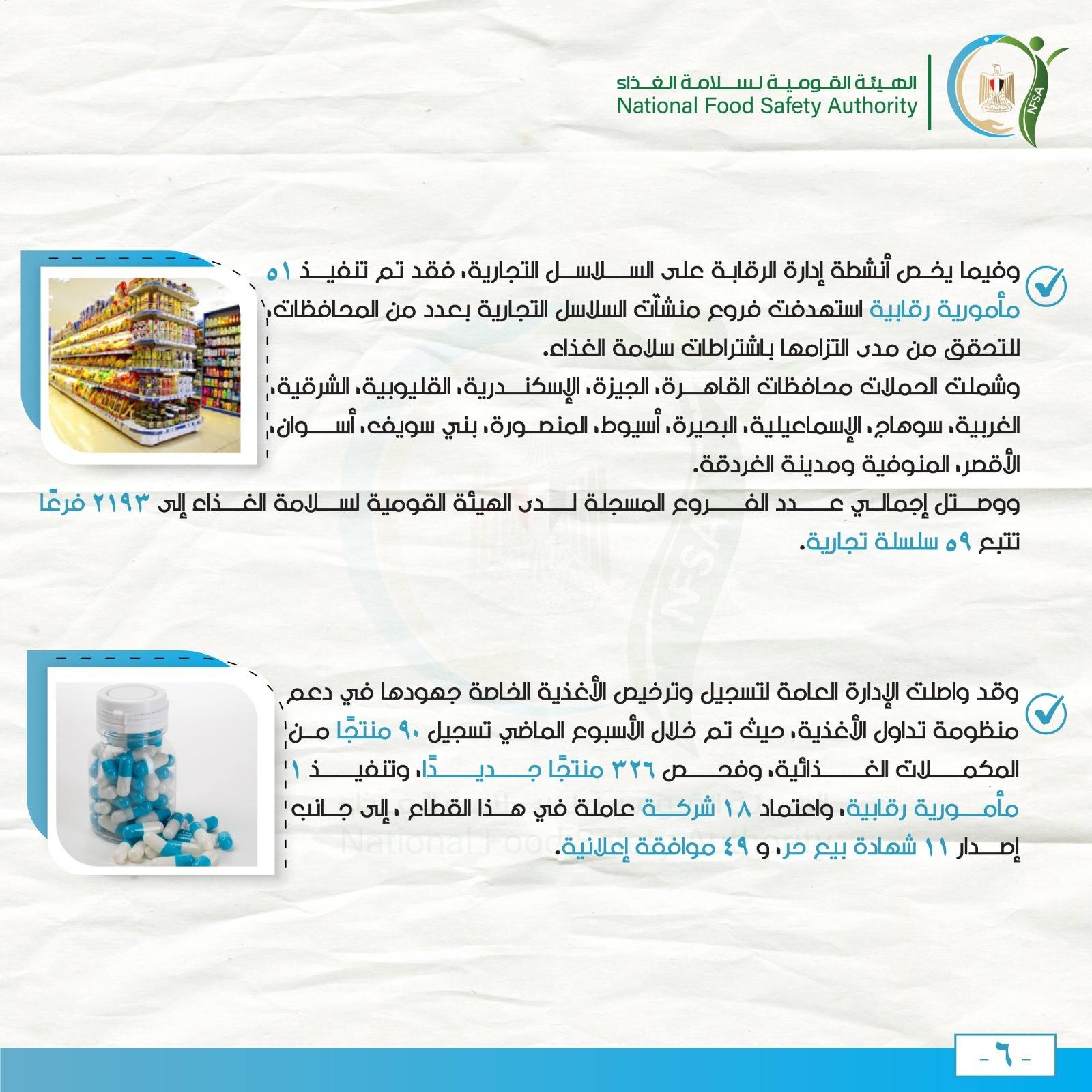 وفيما يخص أنشطة إدارة الرقابة على السلاسل التجارية، فقد تم تنفيذ 51 مأمورية رقابية استهدفت فروع منشآت السلاسل التجارية بعدد من المحافظات، للتحقق من مدى التزامها باشتراطات سلامة الغذاء.