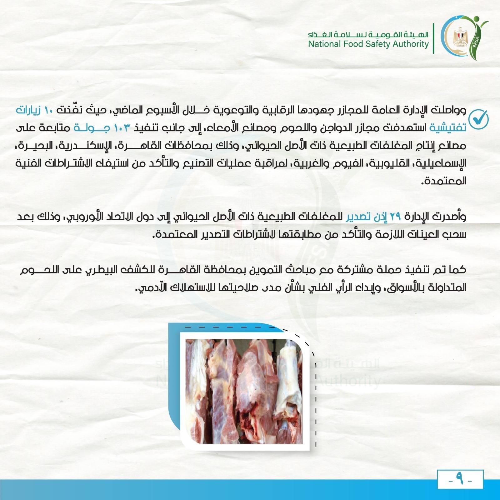 وواصلت الإدارة العامة للمجازر جهودها الرقابية والتوعوية خلال الأسبوع الماضي، حيث نفّذت 10 زيارات تفتيشية استهدفت مجازر الدواجن واللحوم ومصانع الأمعاء، إلى جانب تنفيذ 103 جولة متابعة على مصانع إنتاج المغلفات الطبيعية ذات الأصل الحيواني، وذلك بمحافظات القاهرة، الإسكندرية، البحيرة، الإسماعيلية، القليوبية، الفيوم والغربية، لمراقبة عمليات التصنيع والتأكد من استيفاء الاشتراطات الفنية المعتمدة.