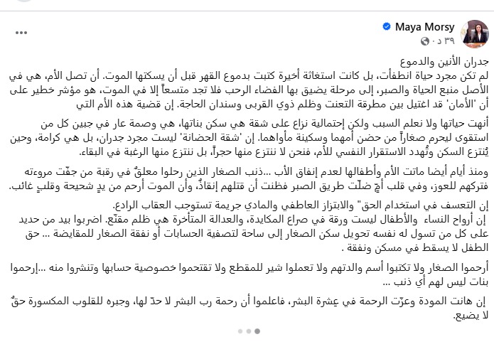 وأشارت الوزيرة في منشورها إلى أن بعض الوقائع الإنسانية تعكس حجم المعاناة التي قد تمر بها بعض الأمهات في ظل النزاعات الأسرية والخلافات حول الحقوق مثل السكن والحضانة والنفقة، مؤكدة أن هذه النزاعات قد تتحول في بعض الحالات إلى ضغوط قاسية تهدد الاستقرار الأسري والنفسي.