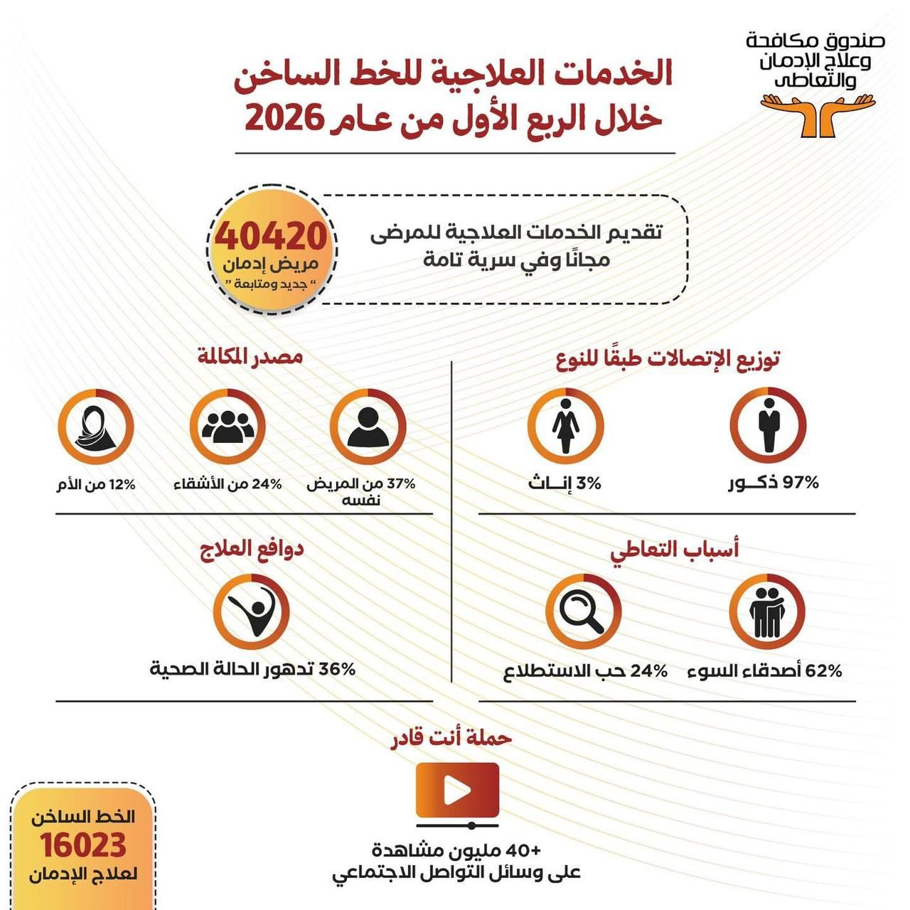 نشر صندوق مكافحة وعلاج الإدمان والتعاطي انفوجراف على الصفحة الرسمية للصندوق " الفيس بوك "عن مجهودات الخط الساخن للصندوق "16023"، خلال الربع الأول من عام 2026 ،حيث تم تقديم الخدمات العلاجية لعدد 40420 مريض "جديد ومتابعة"، كما يتم توفير الخدمات العلاجية لأى مريض إدمان من أبناء المناطق المطورة "بديلة العشوائيات" “الأسمرات، المحروسة، روضة السودان، روضة السيدة، أهالينا، الخيالة، بشاير الخير، حدائق أكتوبر”.