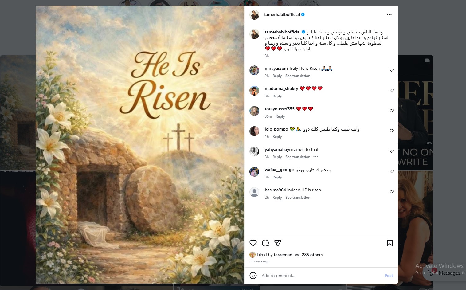 نشر السيناريست تامر حبيب تعليق طريف بشأن تهاني عيد القيامة، وذلك عبر حسابه على موقع تبادل الصور والفيديوهات “إنستجرام”.