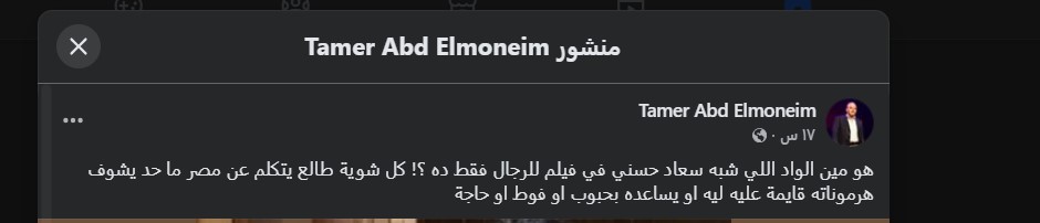 ونشر الفنان تامر عبد المنعم عبر حسابه الشخصي بموقع التواصل الاجتماعي فيسبوك قائلاً: "هو مين الواد اللي شبه سعاد حسني في فيلم للرجال فقط ده؟!، كل شوية طالع يتكلم عن مصر، ما حد يشوف هرموناته قايمة عليه ليه أو يساعده بحبوب أو فوط أو حاجة".
