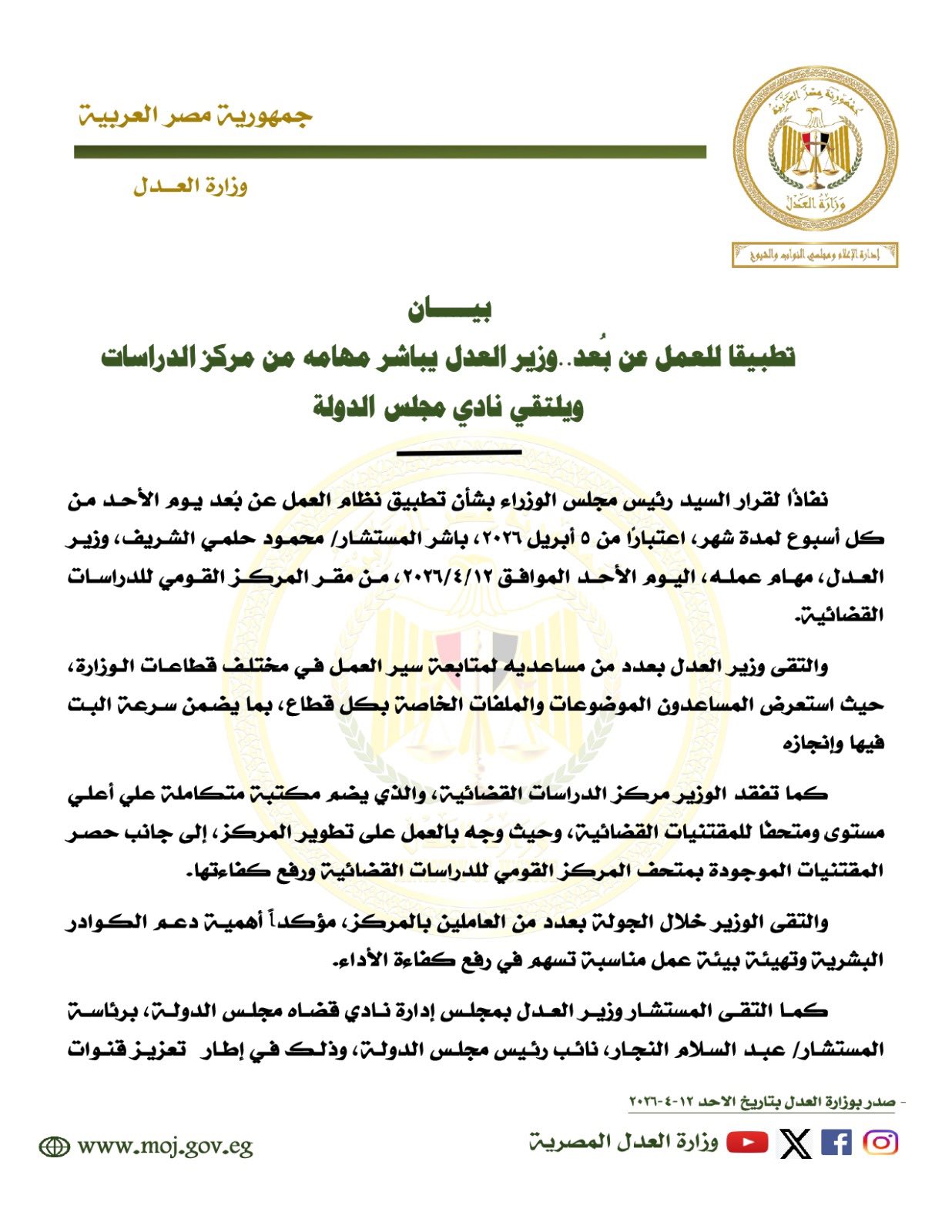 باشر المستشار محمود حلمي الشريف، وزير العدل، مهام عمله اليوم الأحد 12 أبريل 2026، من مقر المركز القومي للدراسات القضائية، وذلك تنفيذًا لقرار رئيس مجلس الوزراء بشأن تطبيق نظام العمل عن بعد يوم الأحد من كل أسبوع لمدة شهر، اعتبارًا من 5 أبريل 2026.