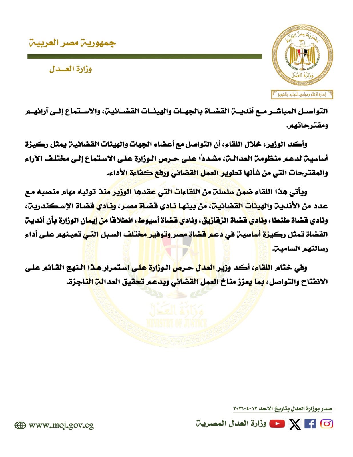 واختتم الوزير بالتأكيد على استمرار نهج التواصل والانفتاح مع مختلف أندية القضاة، بما يعزز بيئة العمل ويدعم تطوير المنظومة القضائية.