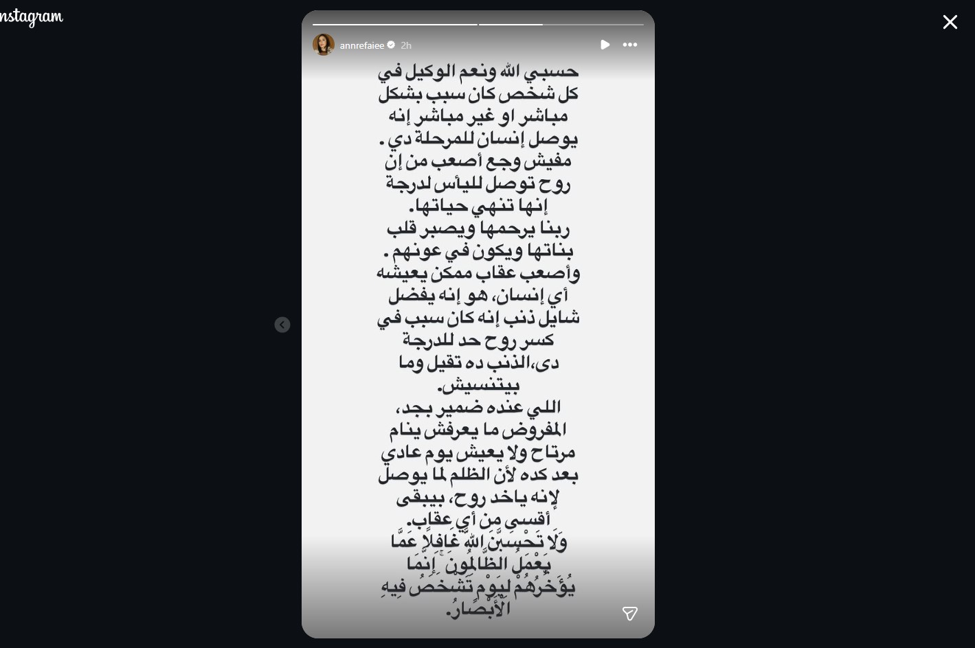 وقامت آن رفاعي بنشر رسالة عبر خاصية "الاستوري" على حسابها الشخصي بموقع التواصل الاجتماعي "إنستغرام"، وقالت: "حسبي الله ونعم الوكيل في كل شخص كان سببًا بشكل مباشر أو غير مباشر في إنه يوصل إنسان للمرحلة دي".