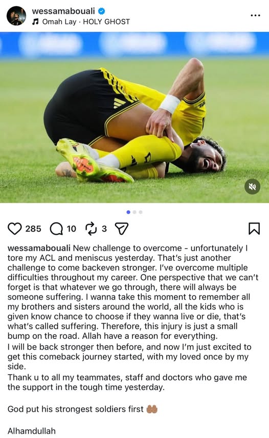 حرص الفلسطيني وسام أبو علي، مهاجم الأهلي السابق وكولومبوس الأمريكي الحالي، على التعليق على إصابته بالتمزق في الرباط الصليبي.