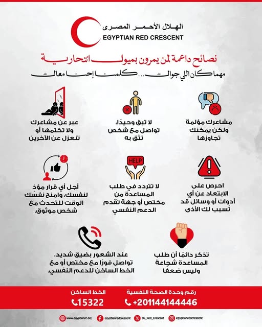 قدم الهلال الأحمر المصري مجموعة من النصائح التوعوية والداعمة للأشخاص الذين يمرون بميول انتحارية، تحت شعار: «مهما كان اللي حواليك.. كلمنا إحنا معاك»، وذلك في إطار جهوده لتعزيز الدعم النفسي ونشر الوعي المجتمعي.