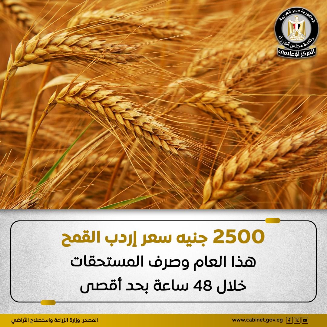 في إطار حرص الدولة على دعم الفلاح المصري وتشجيعه وضمان عائد مجزٍ له، أعلنت وزارة الزراعة واستصلاح الأراضي زيادة سعر توريد القمح هذا العام إلى 2500 جنيه للإردب، بتوجيه مباشر من القيادة السياسية.