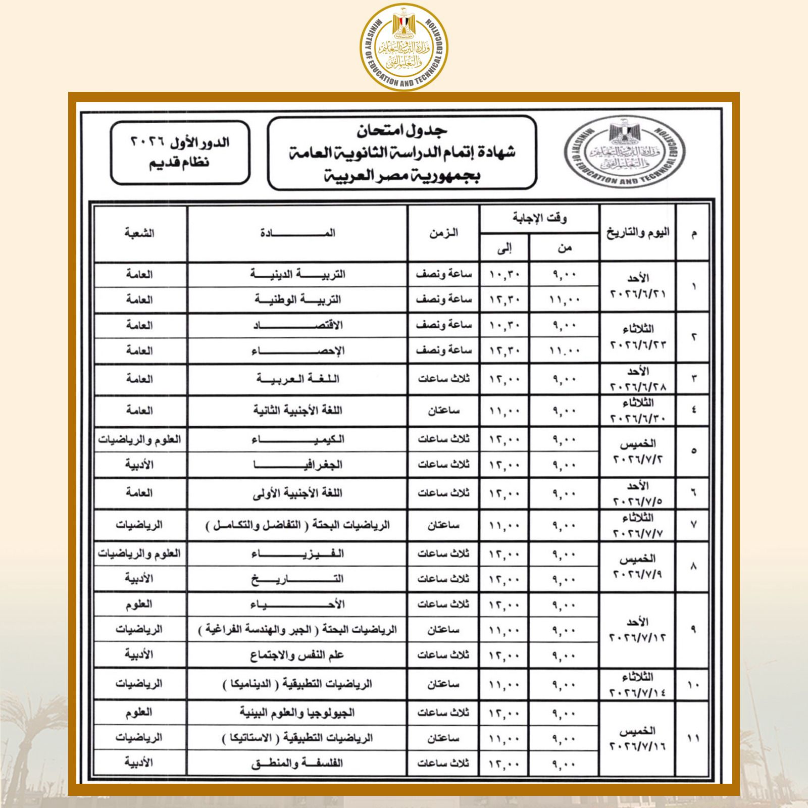 ننشر جدول امتحانات الثانوية العامة نظام جديد للعام الدراسي 2026