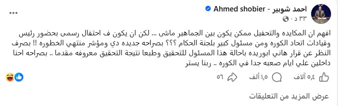 وقال أحمد شوبير عبر صفحته على فيسبوك: «أفهم أن المكايدة والتحفيل ممكن يكون بين الجماهير ماشي، لكن أن يكون في احتفال رسمى بحضور رئيس وقيادات اتحاد الكوره ومن مسئول كبير بلجنة الحكام ؟؟؟ بصراحة جديدة دي ومؤشر منتهي الخطورة !!».