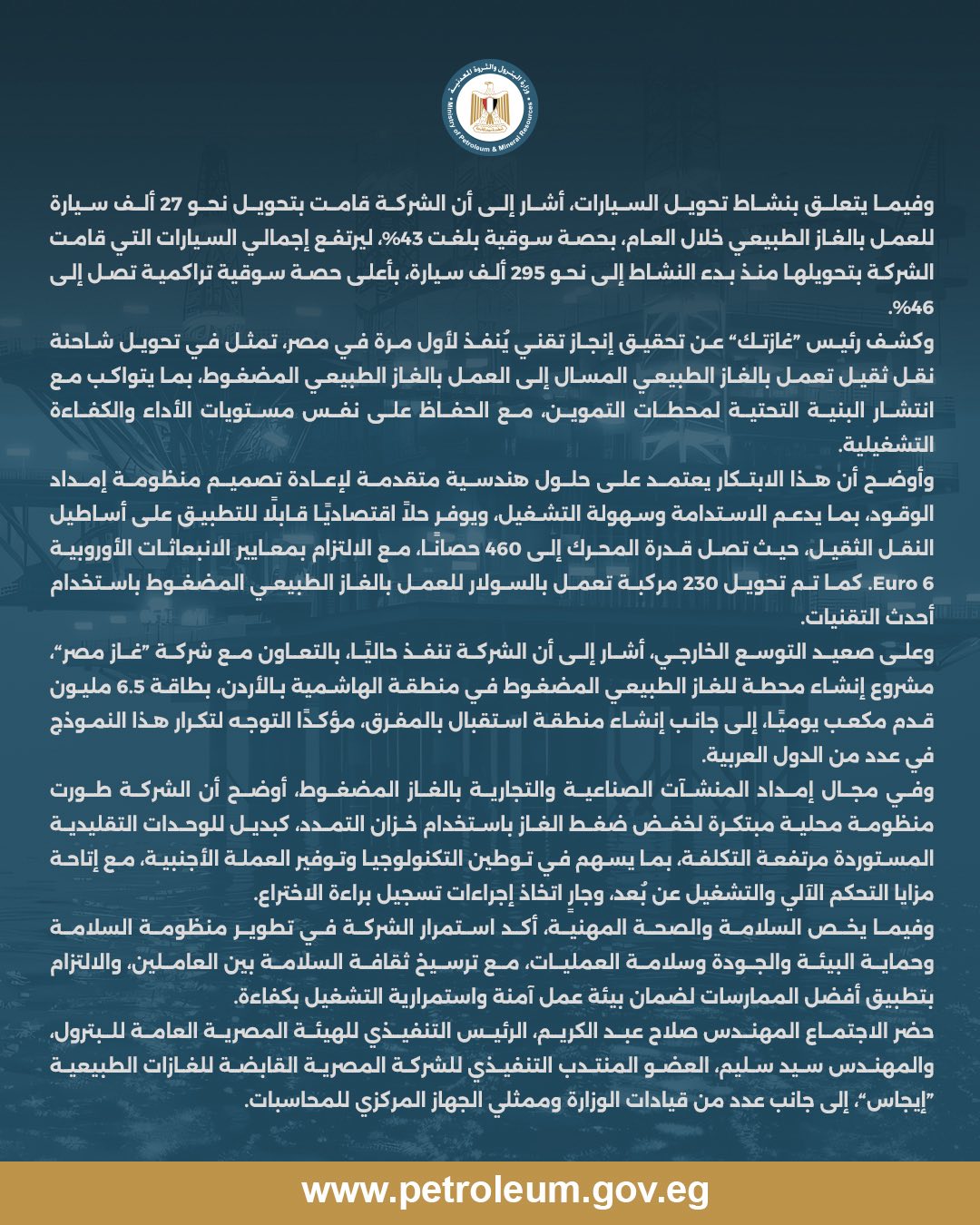 وكشف رئيس “غازتك” عن تحقيق إنجاز تقني يُنفذ لأول مرة في مصر، تمثل في تحويل شاحنة نقل ثقيل تعمل بالغاز الطبيعي المسال إلى العمل بالغاز الطبيعي المضغوط، بما يتواكب مع انتشار البنية التحتية لمحطات التموين، مع الحفاظ على نفس مستويات الأداء والكفاءة التشغيلية.