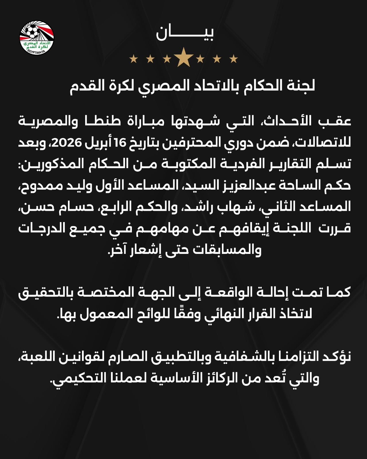 عقب الأحداث التي شهدتها مباراة طنطا والمصرية للاتصالات، ضمن دوري المحترفين بتاريخ 16 أبريل 2026، وبعد تسلم التقارير الفردية المكتوبة من الحكام المذكورين حكم الساحة عبد العزيز السيد المساعد الأول وليد ممدوح المساعد الثاني، شهاب راشد، والحكم الرابع، حسام حسن قررت اللجنة إيقافهم عن مهامهم في جميع الدرجات والمسابقات حتى إشعار آخر.