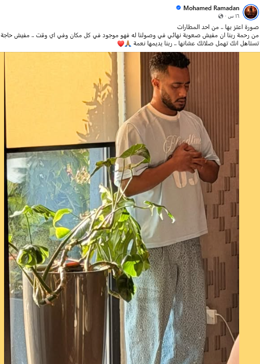 ونشر محمد رمضان الصورة عبر حسابها الخاص بموقع التواصل الاجتماعي “فيسبوك”، وعلق عليها قائلا: صورة اعتز بها من أحد المطارات من رحمة ربنا، إن مفيش صعوبة نهائي في وصولنا له فهو موجود في كل مكان وفي أي وقت ، مفيش حاجة تستاهل إنك تهمل صلاتك عشانها، ربنا يديمها نعمة.