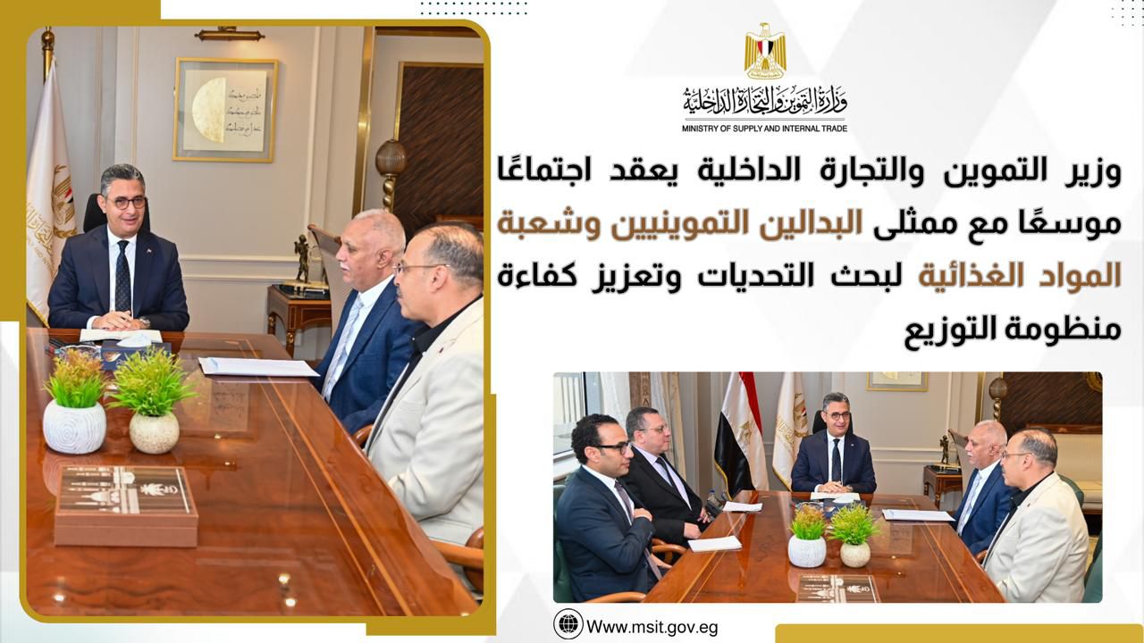 في إطار تنفيذ خطة الوزارة لتطوير منظومة التجارة الداخلية وتعزيز استقرار الأسواق، عقد وزير التموين اجتماعًا موسعًا مع ممثلي البدالين التموينيين وشعبة المواد الغذائية، وذلك لبحث مختلف التحديات التشغيلية والتجارية، والعمل على وضع حلول عملية وفورية بما يضمن انتظام العمل ورفع كفاءة الخدمات المقدمة للمواطنين.