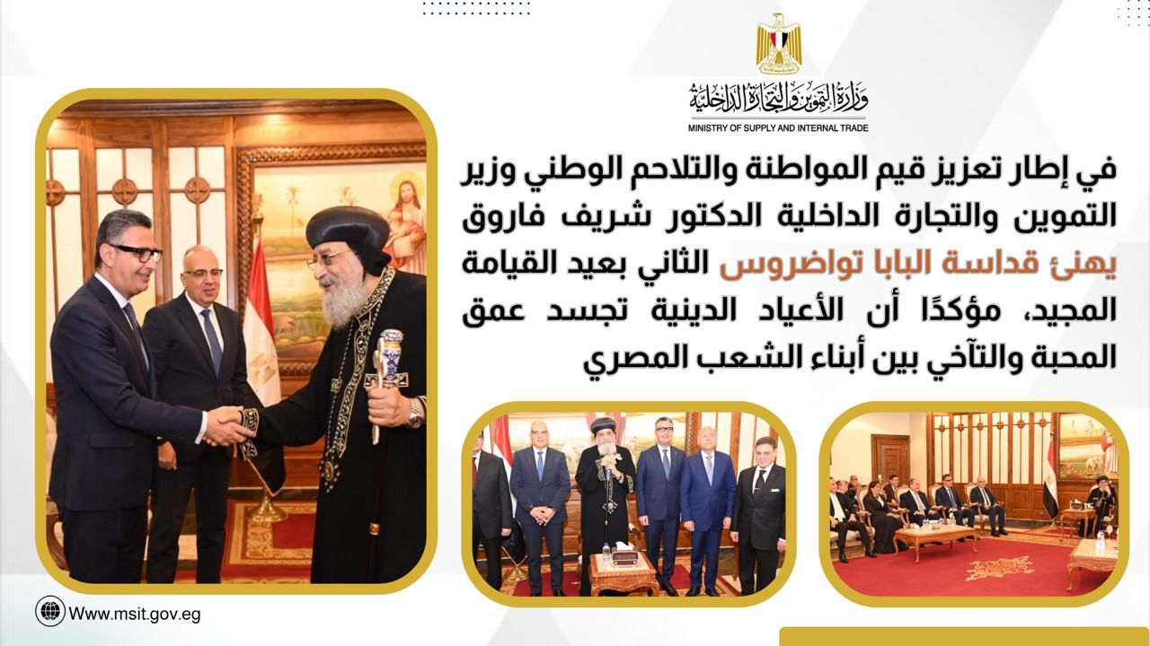 و أعرب الوزير عن خالص تهانيه لقداسة البابا ولجميع الإخوة الأقباط بهذه المناسبة المباركة، داعيًا الله أن يعيدها على مصرنا الغالية بمزيد من الأمن والاستقرار والتقدم، وأن تظل روح المحبة والتسامح التي يتميز بها الشعب المصري نموذجًا فريدًا في التعايش والوحدة الوطنية.