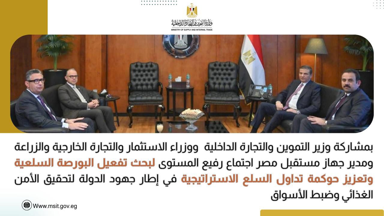 في إطار تنفيذ رؤية القيادة السياسية، بشأن تعزيز منظومة الأمن الغذائي وضبط أسواق السلع الرئيسية، شارك الدكتور شريف فاروق وزير التموين والتجارة الداخلية في اجتماعًا رفيع المستوى ضم الدكتور محمد فريد صالح، وزير الاستثمار والتجارة الخارجية، والسيد علاء فاروق، وزير الزراعة واستصلاح الأراضي، ودكتور بهاء الغنام، المدير التنفيذي لجهاز مستقبل مصر للتنمية المستدامة، والدكتور زكريا حمزة رئيس البورصة السلعية.