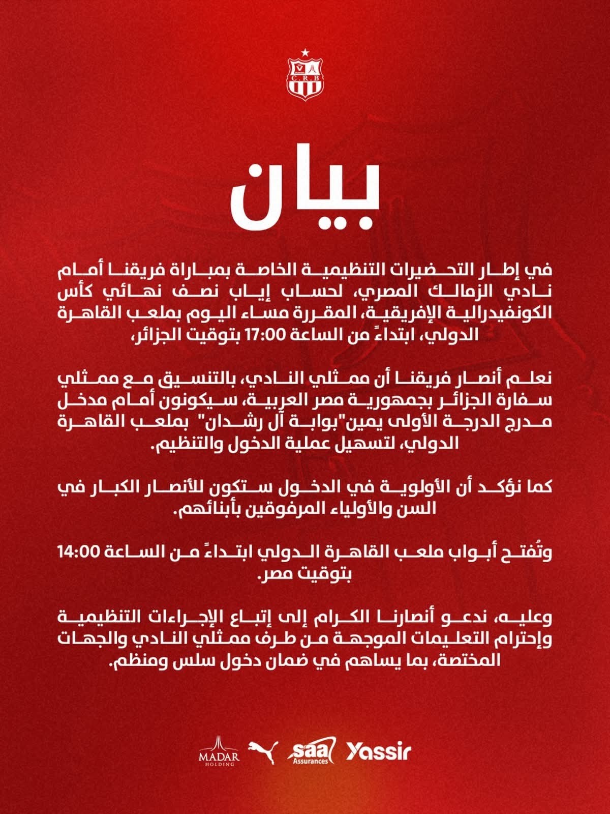 أصدر نادي شباب بلوزداد بيانًا رسميًا يوضح من خلاله الترتيبات التنظيمية الخاصة بجماهيره، قبل مواجهة نادي الزمالك في إياب نصف نهائي كأس الكونفدرالية الإفريقية، والمقرر إقامتها على ملعب القاهرة الدولي.