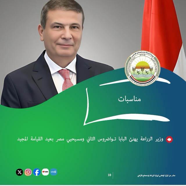 كما بعث الوزير برقية تهنئة إلى البابا تواضروس الثاني ومسيحيي مصر وخارجها بمناسبة عيد القيامة المجيد، مؤكدا حرص الوزارة على التواصل والتفاعل مع جميع المواطنين في المناسبات الدينية والوطنية.