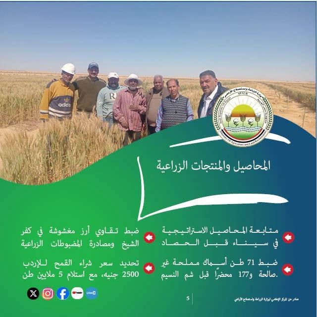وفيما يتعلق بالمحاصيل والمنتجات الزراعية، تابعت الوزارة التجمعات الزراعية في سيناء استعدادا لحصاد المحاصيل الاستراتيجية، مع ضبط الأسواق لضمان سلامة المنتجات، حيث تم ضبط 71 طن أسماك مملحة غير صالحة للاستهلاك، وتحفظ على كميات كبيرة من تقاوي الأرز المغشوشة في كفر الشيخ، ومصادرة المضبوطات مع اتخاذ الإجراءات القانونية.
