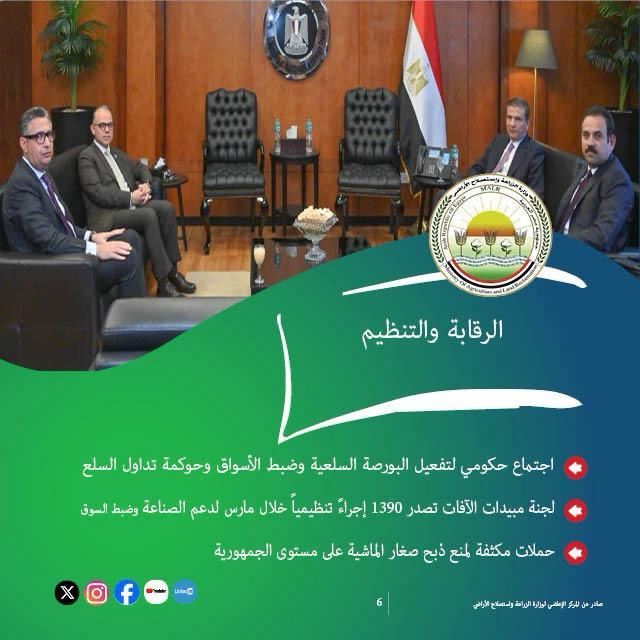 وأصدرت لجنة مبيدات الآفات 1390 إجراء تنظيميا خلال مارس، شملت تصاريح وتراخيص وشهادات تسجيل وموافقات فنية لدعم صناعة المبيدات وضبط السوق، فيما عقد اجتماع حكومي لتفعيل البورصة السلعية لضبط الأسواق وحوكمة تداول السلع الأساسية.