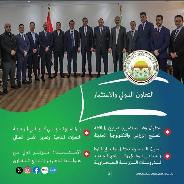 وعلى صعيد التعاون الدولي والاستثمار، استقبل علاء فاروق وزير الزراعة وفود من المستثمرين ورجال الأعمال الصينيين لمناقشة فرص الاستثمار المشترك في التصنيع الزراعي والتكنولوجيا الحديثة.