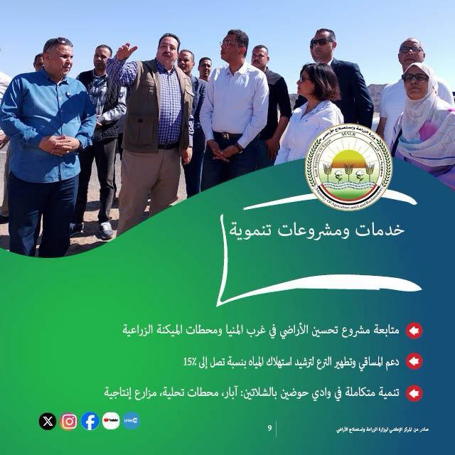 فيما يخص المشروعات والخدمات التنموية، تابعت الوزارة مشروع تحسين الأراضي بمحافظة المنيا، ورافقت ذلك بدعم المزارعين من خلال ميكنة الإنتاج الحيواني والآلات الزراعية، بالإضافة إلى استمرار أعمال تطوير المساقي وترشيد استهلاك المياه عبر تطهير الترع بنسبة تصل إلى 15٪.