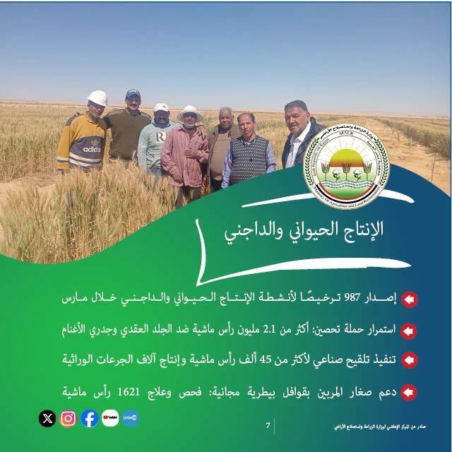 وفي مجال الإنتاج الحيواني والداجني، أعلنت الوزارة أنها أصدرت خلال شهر مارس 987 ترخيصا جديدا لتشغيل مشروعات الثروة الحيوانية والداجنة ومراكز الألبان، مع التركيز على تحسين الجودة والكفاءة الإنتاجية.