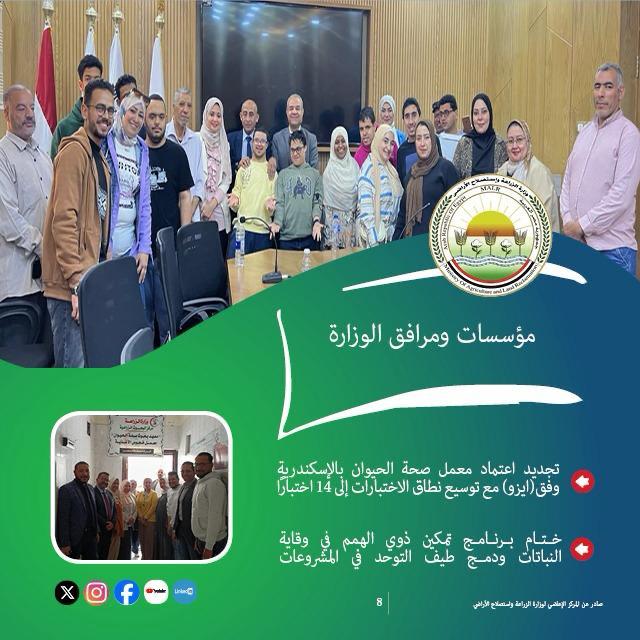 أما على صعيد المؤسسات والمرافق التابعة للوزارة، فقد جرى تجديد اعتماد معمل صحة الحيوان بالإسكندرية وفق المواصفة الدولية ISO، مع توسيع نطاق الاختبارات ليشمل 14 اختبارا، فضلا عن ختام برنامج تدريبي لتمكين ذوي الهمم في مجال وقاية النباتات ودمج طيف التوحد في مشروعات إنتاج الأعداء الحيوية.