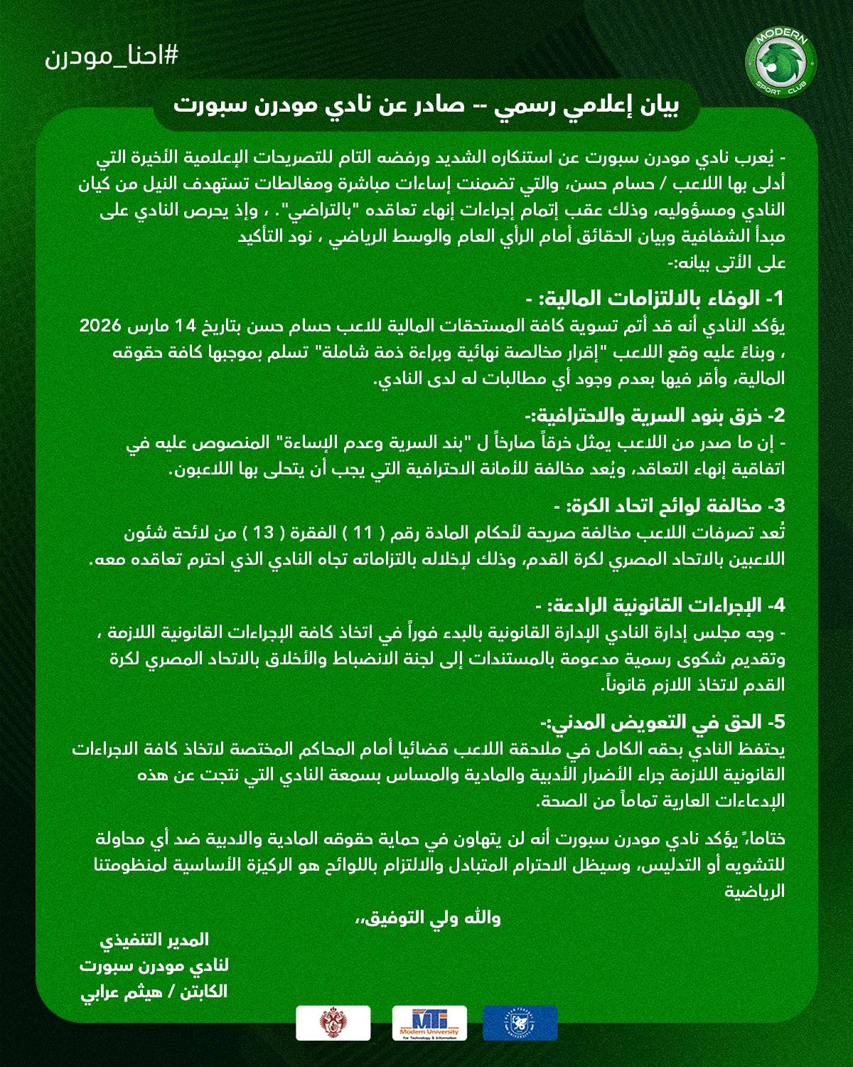 واختتم: «يؤكد نادي مودرن سبورت أنه لن يتهاون في حماية حقوقه المادية والادبية ضد أي محاولة للتشويه أو التدليس، وسيظل الاحترام المتبادل والالتزام باللوائح هو الركيزة الأساسية لمنظومتنا الرياضية».