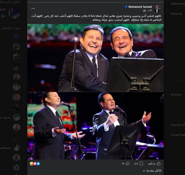 حيث شارك المطرب الكبير محمد ثروت جمهوره منشورًا على حسابة الشخصى بموقع التواصل الأجتماعى «فيسبوك» مؤثرًا دعا فيه بالشفاء العاجل للفنان هاني شاكر، حيث كتب: “ اللهم اشفِ أخي وحبيبي وعِشرة عمري هاني شاكر شفاءً تامًا لا يغادر سقماً، اللهم أذهب عنه كل بأس، اللهم أنت الشافي لا شفاء إلا شفاؤك، اللهم استجب بحق عزتك وجلالك” .