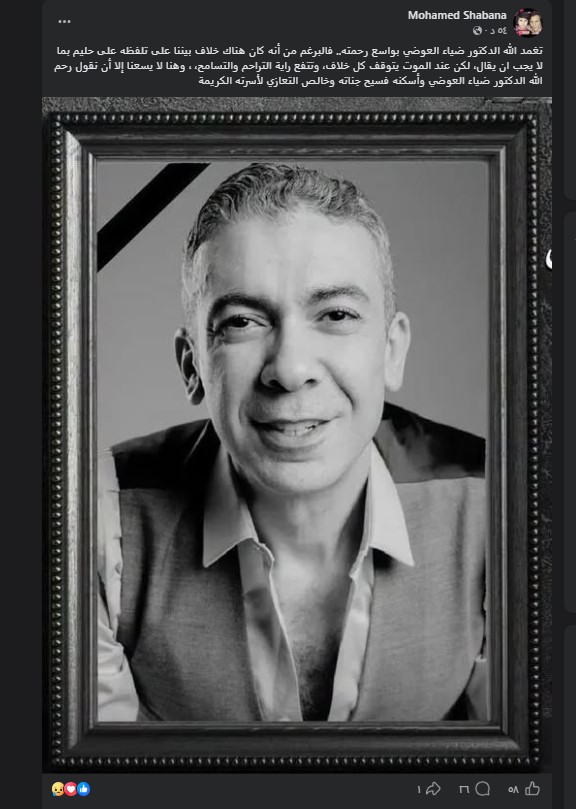 حرص محمد شبانة، نجل شقيق العندليب عبد الحليم حافظ، على نعي الدكتور ضياء العوضي، من خلال منشور عبر حسابه الرسمي على موقع فيسبوك، عبّر فيه عن موقف إنساني رغم الخلافات السابقة بينهما.