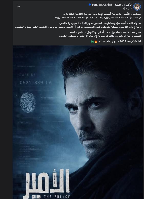ونشر المستشار تركي آل الشيخ عبر حسابة الشخصى عبر موقع التوصل الاجتماعى "فيسبوك " بوستر يحمل اسم المسلسل وصورة النجم احمد عز وعلق عليها قائلا : " مسلسل “الأمير” واحد من أضخم الإنتاجات الدرامية العربية القادمة برعاية الهيئة العامة للترفيه GEA " .