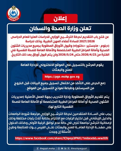 تعلن وزارة الصحة والسكان عن فتح باب التقديم لحركة الترشيح الوزاري للدراسات العليا للعام الدراسي 2026/2027 للسادة أعضاء المهن الطبية، وذلك لدراسة (دبلوم - ماجستير - دكتوراه)، مع قبول الأوراق المطلوبة بجميع مديريات الشئون الصحية وأمانة المراكز الطبية المتخصصة والأمانة العامة للصحة النفسية، خلال الفترة من 23/4/2026 حتى 24/5/2026، ولن يتم قبول أوراق بعد هذا التاريخ.