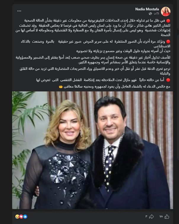 وقالت الفنانة نادية مصطفى عبر رسالة على حسابة الشخصى بموقع التواصل الاجتماعى “فيسبوك ” : في ظل ما تم تداوله خلال إحدى المداخلات التليفزيونية من معلومات غير دقيقة بشأن الحالة الصحية للفنان الكبير هاني شاكر .. نؤكد أن ما ورد على لسان رئيس الجالية في فرنسا لا يعكس الحقيقة وقد تضمّنت إجتهادات شخصية وهو ليس على إتصال بأسرة الفنان ولا مع السفارة ولا القنصلية ومعلوماته لا أساس لها من الصحة ".