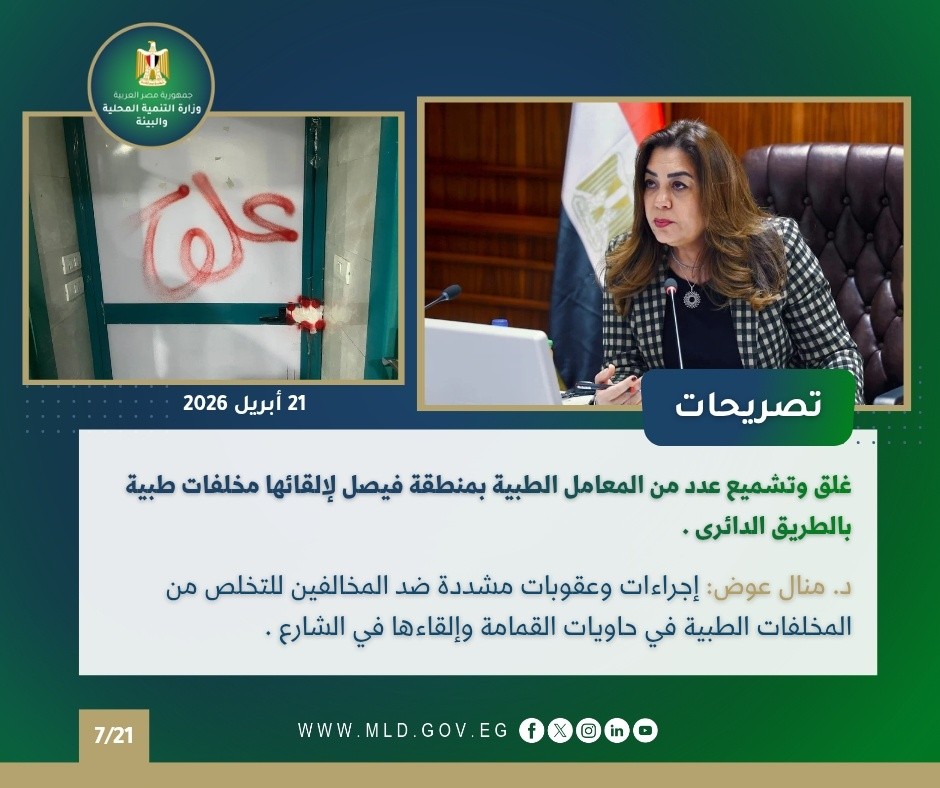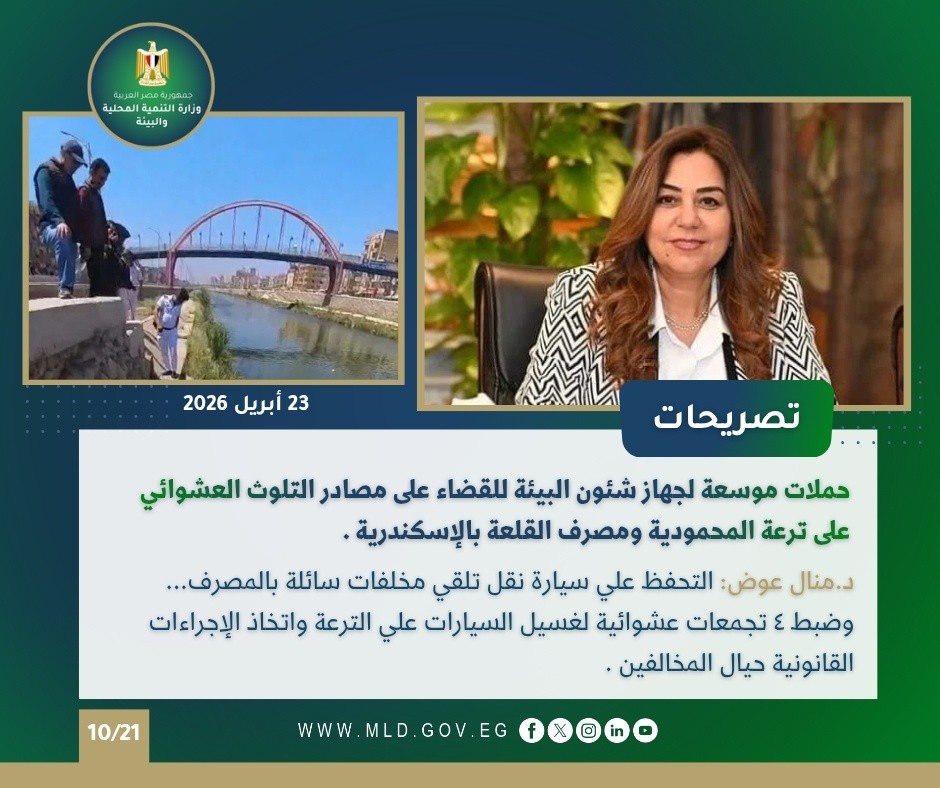 أصدر المركز الإعلامي لوزارة التنمية المحلية والبيئة “الإنفوجراف الأسبوعي” في نسخته الـ185، والذي يستعرض أبرز أنشطة وفعاليات الوزارة بقيادة الدكتورة منال عوض، وزيرة التنمية المحلية والبيئة، خلال الفترة من 17 إلى 23 أبريل 2026، متضمنًا مجموعة من الاجتماعات والفعاليات ومتابعة المشروعات التنموية على مستوى الجمهورية.