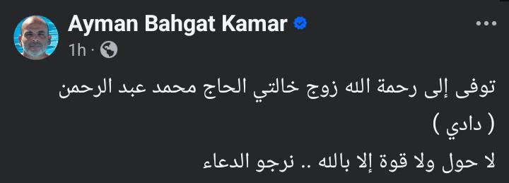 وكتب أيمن بهجت قمر عبر حسابه الرسمي بموقع التواصل الاجتماعي “فيسبوك”: توفى إلى رحمة الله زوج خالتي الحاج محمد عبد الرحمن دادي لا حول ولا قوة إلا بالله ، نرجو الدعاء.