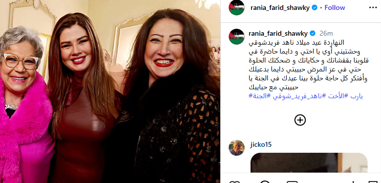 ونشرت رانيا فريد شوقي صورة لها مع شقيقتها الراحلة، وذلك عبر حسابها الرسمي بموقع التواصل الاجتماعي “انستجرام”، وعلقت عليها قائلة: النهاردة عيد ميلاد ناهد فريدشوقي وحشتيني أوي يا أختي، و دايما حاضرة في قلوبنا بقفشاتك و حكاياتك و ضحكتك الحلوة، حتي في عز المرض حبيبتي دايما بدعيلك، وأفتكر كل حاجة حلوة بينا، عيدك في الجنة يا حبيبتي مع حبايبك.