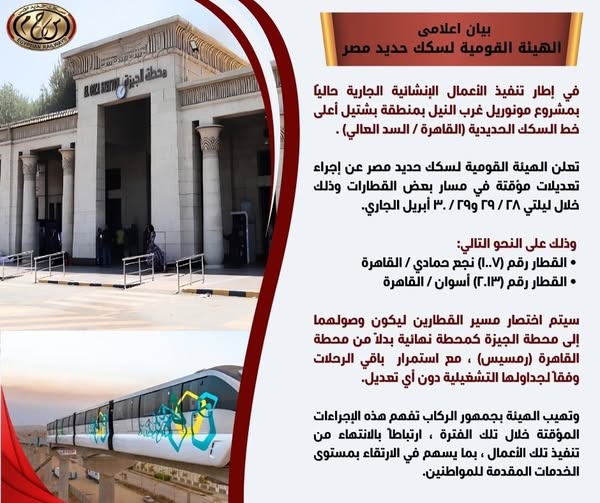 أعلنت الهيئة القومية لسكك حديد مصر، في بيان إعلامي، أنه في إطار تنفيذ الأعمال الإنشائية الجارية بمشروع مونوريل غرب النيل بمنطقة بشتيل أعلى خط السكك الحديدية (القاهرة/السد العالي)، سيتم إجراء تعديلات مؤقتة في مسير بعض القطارات.
