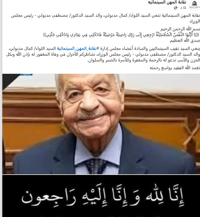 وأضاف البيان: ينعي السيد نقيب السينمائيين والسادة أعضاء مجلس إدارة #نقابة_المهن_السينمائية السيد اللواء/ كمال مدبولي، والد السيد الدكتور مصطفى مدبولي، رئيس مجلس الوزراء، نشاطركم الأحزان في وفاة المغفور له بإذن الله وبكل الحزن والأسى ندعو له بالرحمة والمغفرة وللأسرة بالصبر والسلوان، تغمد الله الفقيد بواسع رحمته.