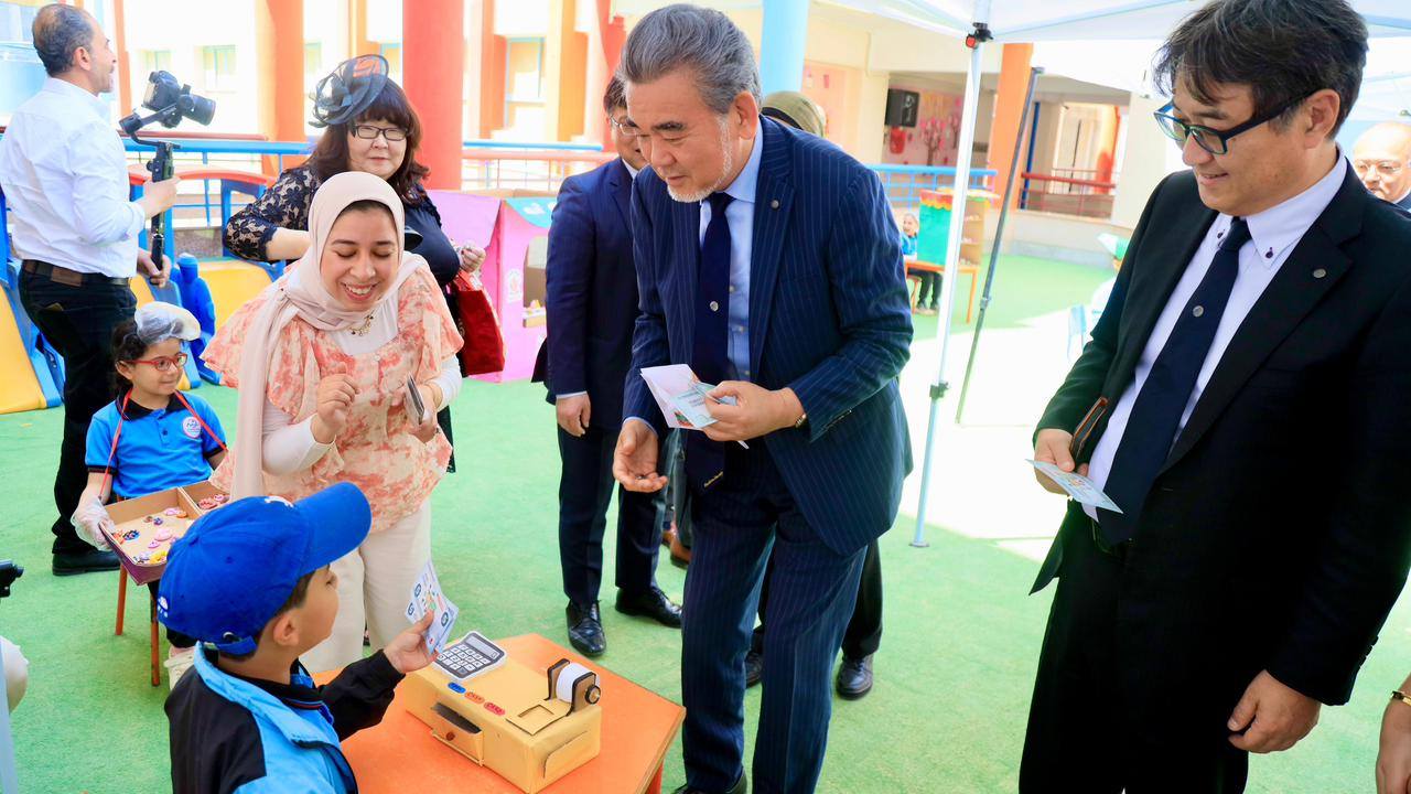 وكان في استقبال الوزير والسادة المسئولين من الجانب الياباني طلاب المدرسة الذين رحبوا بالوفد من خلال أنشطة تفاعلية مميزة، تضمنت تنفيذ أنشطة التعلم باللعب باستخدام الصلصال، ومحاكاة مواقف شرائية في إطار تنمية مهاراتهم الحياتية.