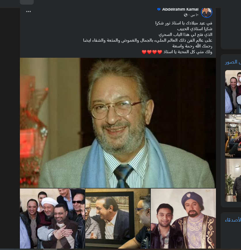 ونشر السيناريست عبد الرحيم كمال عبر حسابه الشخصي بموقع التواصل الاجتماعي مجموعة صور تجمعه مع الفنان الراحل نور الشريف، وعلق عليها قائلاً: في عيد ميلادك يا أستاذ نور، شكراً. شكراً أستاذي الحبيب الذي فتح لي هذا الباب السحري على عالم الفن، ذلك العالم المليء بالجمال والغموض والمتعة والشقاء أيضاً، رحمك الله رحمة واسعة، ولك مني كل المحبة يا أستاذ.