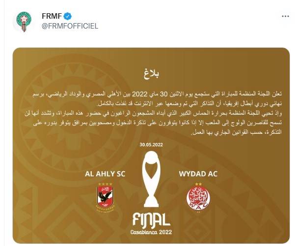 وقال الاتحاد المغربي في بيان رسمي عبر حسابه على موقع التدوينات القصيرة "تويتر": "تعلن اللجنة المنظمة للمباراة التي ستجمع يوم الإثنين 30 مايو 2022، بين الأهلي المصري والوداد الرياضي، برسم نهائي دوري أبطال إفريقيا، أن التذاكر التي تم وضعها عبر الإنترنت قد نفدت بالكامل".